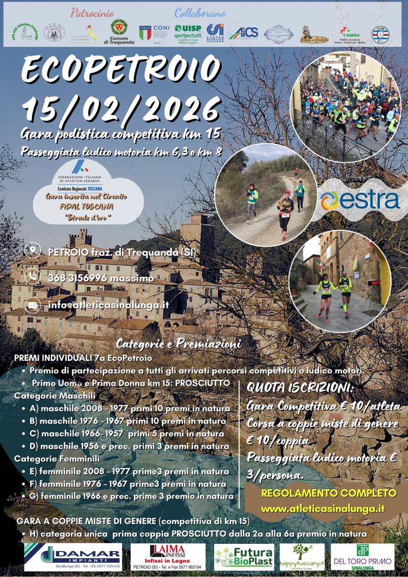 manifestazione podistica nel caratteristico borgo senese diventata ormai un appuntamento fisso per podisti e camminatori. Il programma dell’evento prevede: Gara podistica competitiva di 15 km, con classifiche con le solite categorie per età più una categoria unica per le coppie miste di genere; Passeggiata ludico-motoria, aperta a tutti, con percorsi a scelta di 6,3 km o 8,0 km; Le quote di partecipazione, per chi si iscrive entro Giovedì 12 Febbraio sono: