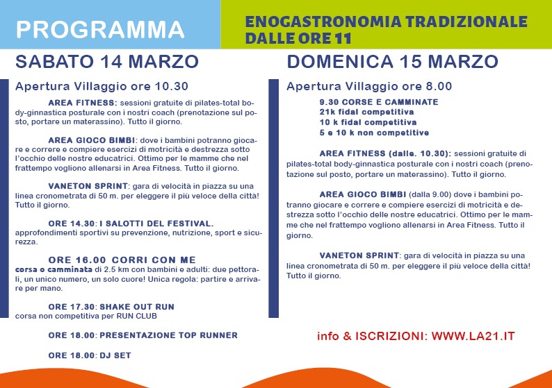 La 21k e la La 10K gare competitive partenza alle 9,30. La 5x tutti e La 10x tutti camminate non competitive partenza alle 9,35. Negli allegati il programma di sabat0 14 marzo e domenica 15 del La 21 di Reggio Emilia- Reggio Sport Festival, oltre ai percorsi della km 10 e km 21